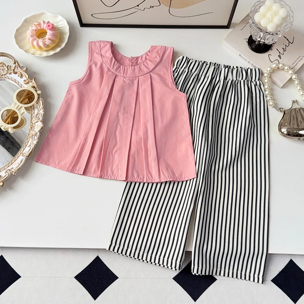 O top apresenta um caimento soltinho com pregas frontais que deixam o visual ainda mais charmoso, garantindo conforto absoluto para brincar, passear e arrasar nas fotos. Já a calça listrada traz um estilo atemporal, com modelagem leve e cintura elástica que se ajusta perfeitamente ao corpo da criança.